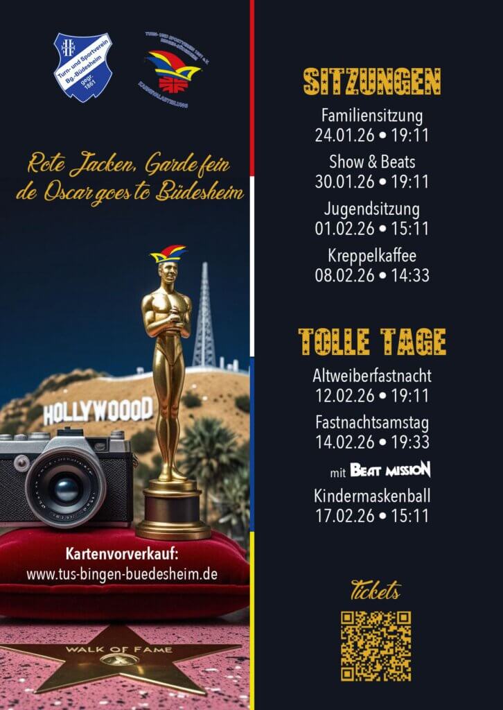 Unter dem Motto „Rote Jacken, Garde fein – de Oscar goes to Büdesheim“ laden wir recht herzlich dazu ein, mit uns die TuS-Saalfastnacht zu feiern. Die Karten können Sie gerne hier bestellen.